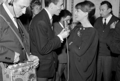 Jeanne Moreau au micro de Radio Monte-Carlo lors d’un cocktail à l’occasion de la sortie du film La Baie des Anges à Nice, au cinéma Monte-Carlo.
