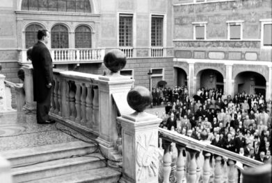 Célébration de l’Avènement du prince Rainier III au Palais princier, le 19 novembre 1949. Le prince Rainier III se tient debout du haut de l’escalier de la cour d’honneur du Palais princier. Il reçoit les acclamations des Monégasques