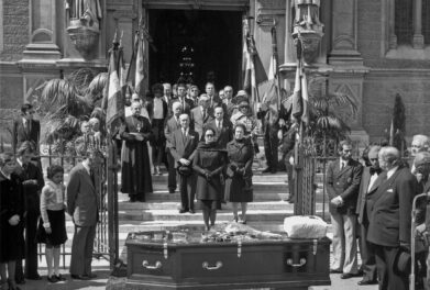 Le cortège funèbre du prince Louis II franchit la porte du Palais princier, le matin du 17 mai 1949. Cette procession, menée par les carabiniers du prince, a débuté depuis la chapelle palatine jusqu’à la Cathédrale.