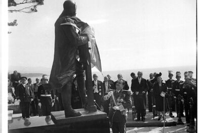 Inauguration du monument Albert Ier dans les jardins Saint-Martin à Monaco, le 11 avril 1951. Le prince Rainier III découvre le monument dédié au prince Albert Ier. La statue est l’œuvre de François Cogné.