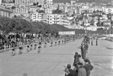 Grand Prix cycliste de Monaco (VIIIe ronde cycliste de Monaco) sur le quai Albert Ier. On aperçoit la banderole annonçant la lignée d’arrivée.
