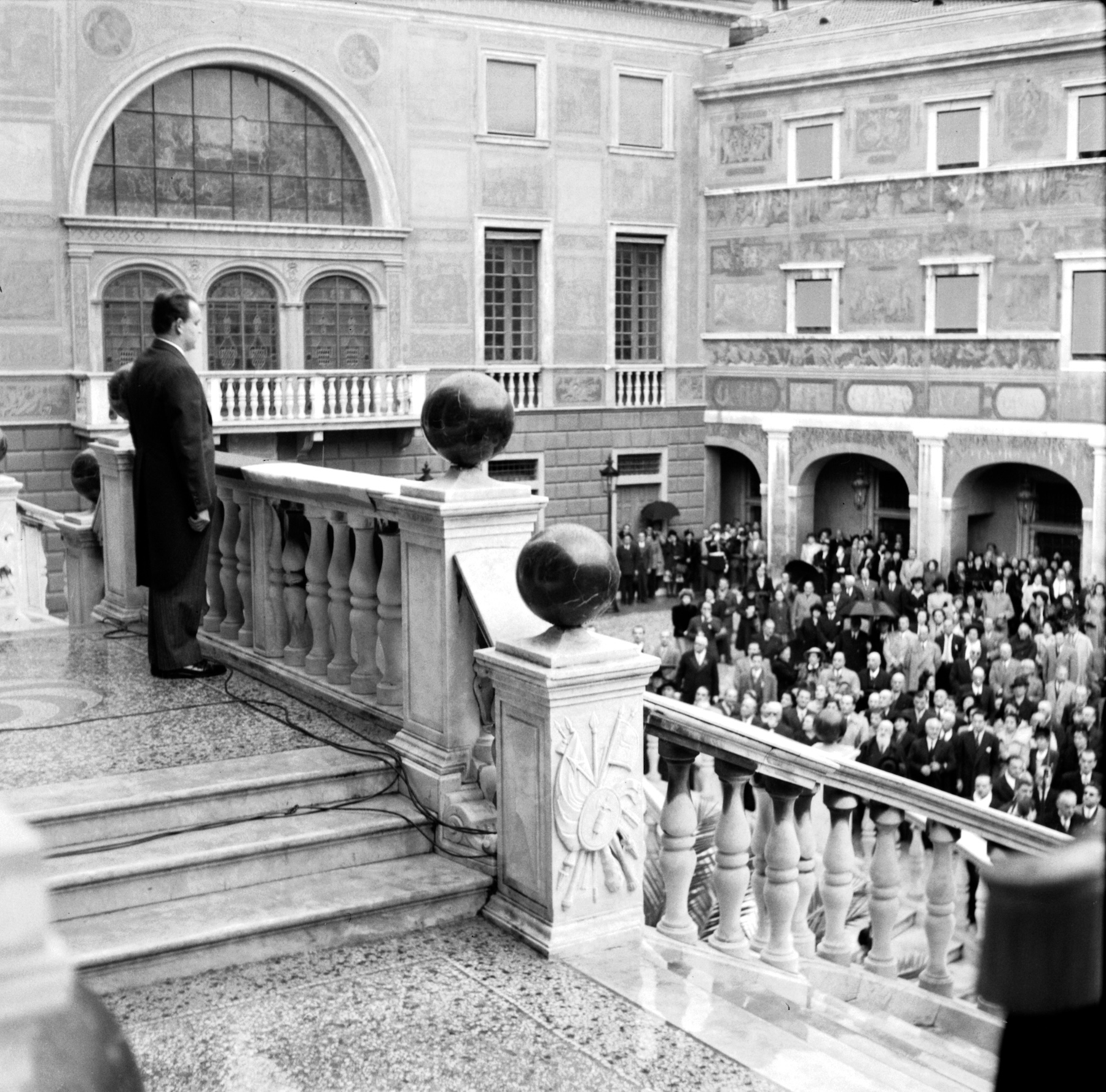 Célébration de l’Avènement du prince Rainier III au Palais princier, le 19 novembre 1949. Le prince Rainier III se tient debout du haut de l’escalier de la cour d’honneur du Palais princier. Il reçoit les acclamations des Monégasques