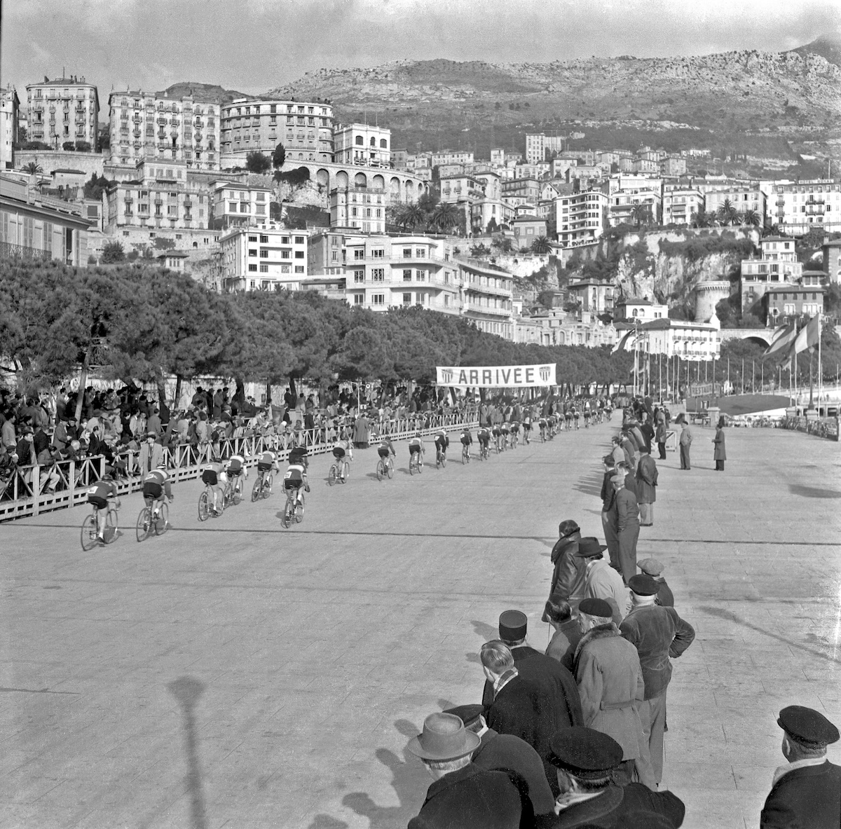 Grand Prix cycliste de Monaco (VIIIe ronde cycliste de Monaco) sur le quai Albert Ier. On aperçoit la banderole annonçant la lignée d’arrivée.