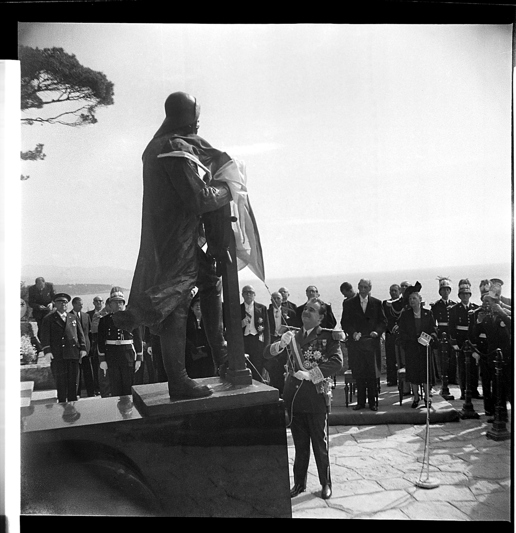 Inauguration du monument Albert Ier dans les jardins Saint-Martin à Monaco, le 11 avril 1951. Le prince Rainier III découvre le monument dédié au prince Albert Ier. La statue est l’œuvre de François Cogné.